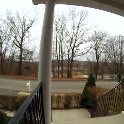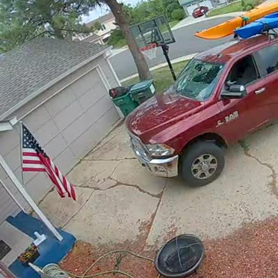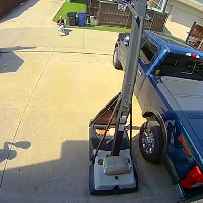 As a mail truck drives out of the driveway, it accidentally hooks onto a basketball hoop. He drags it, then when it hits a tree, it falls off and breaks. Security Footage. No release for the driver of the mail truck.