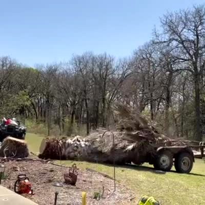 A man pulls down a sawed palm tree into a trailer attached to a truck and it slams into it and the hitch pops off and breaks the tail gate off in the front-yard.