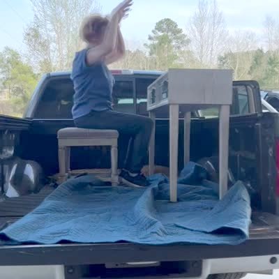 A senior woman pretends to play piano on furniture in back of truck and she misses the stool and falls backwards.