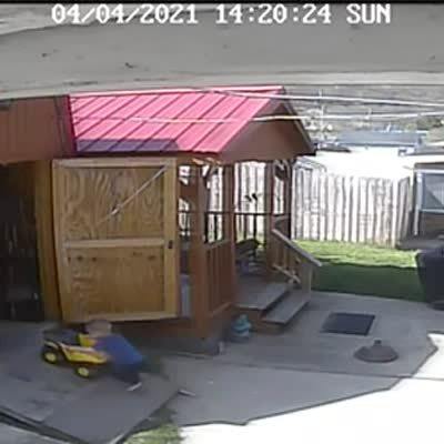 A young boy pushes a toy dump truck up a ramp and into a shed, but he falls into it when it rolls back down the ramp. Security footage.
