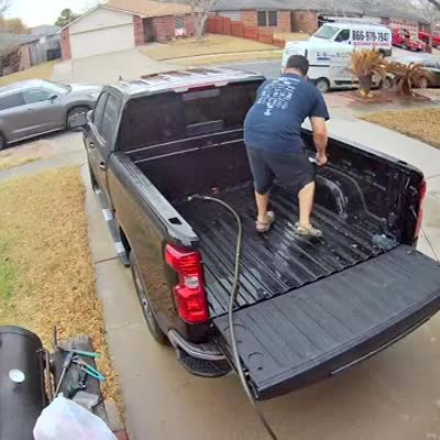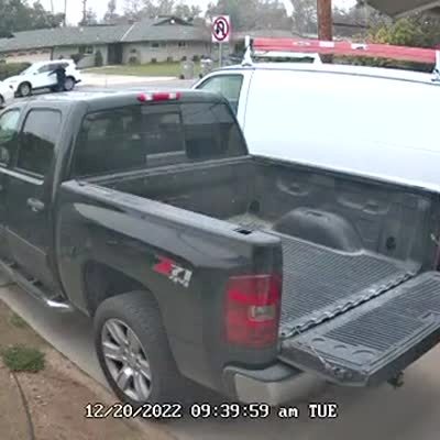 A man tries to slam a pickup truck's tailgate shut on a driveway, but it reopens and hits him in the groin. Security footage. Person across the street not talent released.