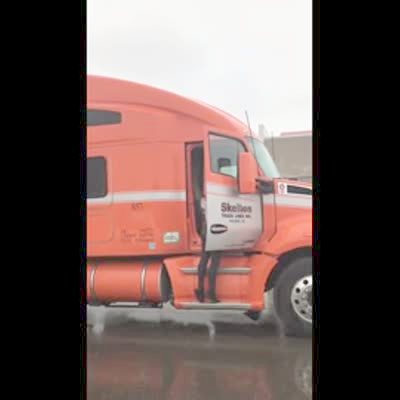 A man stands outside when a large piece of plastic is whipped up by the wind and flies out of a truck bed, hitting him in the face. Security Footage.