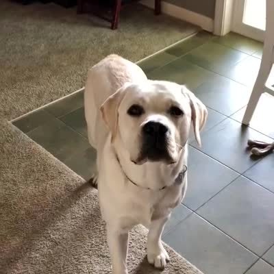 A man asks his Yellow Labrador whether he "would like to go for a ride in the truck?" The dog excitedly jumps on the man and sprints around the room.