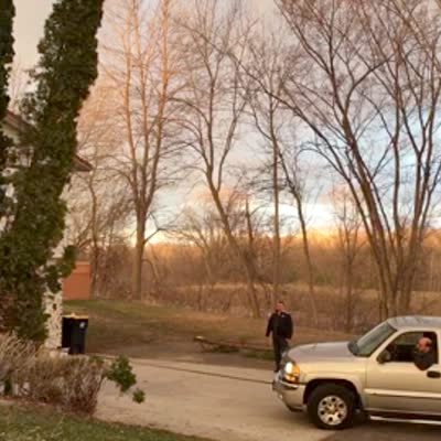 A deer in the driveway jumps over an entire car, then lands in the bed of a different truck. Security Footage. Featured talent cleared (the man in the driveway).