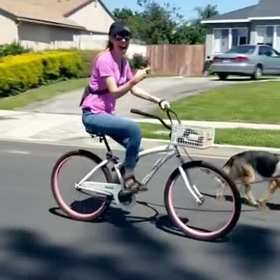 A woman walks a German Shepherd down a street as she rides her bike, celebrating that the dog was just adopted. The distracted man behind the camera crashes his bike into the back of a truck. Music rights not cleared.