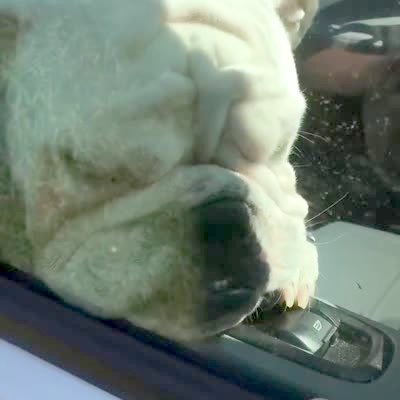 A Bulldog dog rolls down the window of a truck and a woman says "are you kidding?".