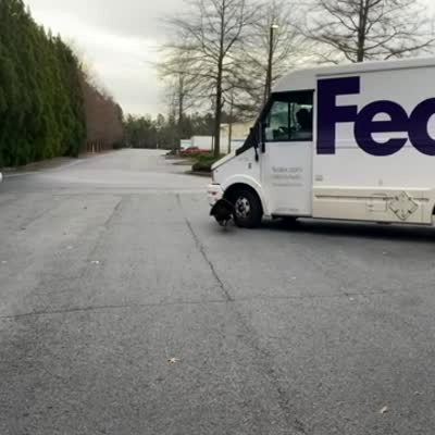 A turkey walks in front of a Fed Ex truck in a parking lot. The truck stops for the turkey and the turkey runs after the truck.