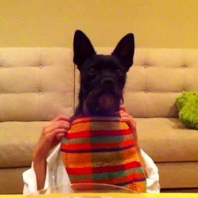 Small black dog with human hands puts on an orange bib and then eats out of tupperware.