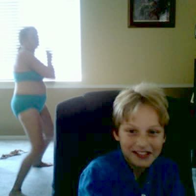 "Webcam Dance Jam" A woman dances to a work out video in her underwear as her son records her on a computer without her knowing indoors. Exercise. Mom.