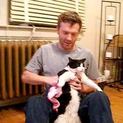 A man sits on the toilet in a bathroom, and a cat sits on his shoulder. He says that he cannot go to the bathroom without the cat, then shows that a second cat also followed him into the bathroom and sat in his underwear.