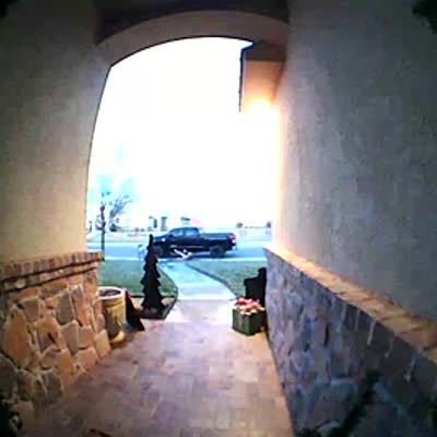 Doorbell security camera footage of a man who walks out of the house in his underwear to a truck parked on the street and then slips on ice on the sidewalk and falls.