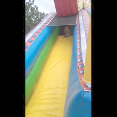 A young girl rides down an inflatable bounce slide and her dress flies up in her face.