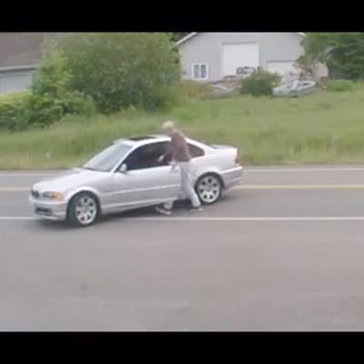 A senior man runs after a car as it rolls backwards into a street but the man's pants fall down and he hangs onto the side of the car.