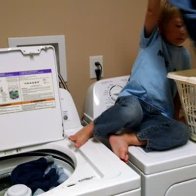 A young boy sits on a washing machine and puts his grandparents' clothes into the machine. He pulls out a pair of his grandma's underwear and says "I like that one."
