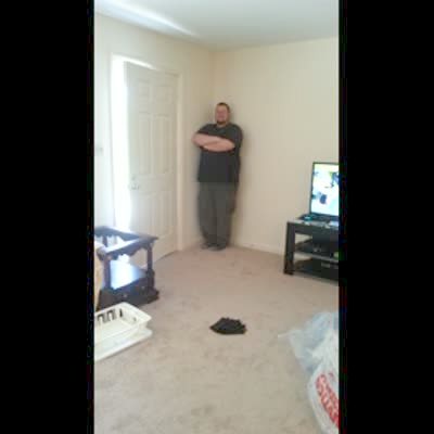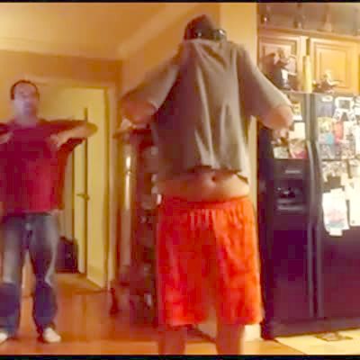 A man pulls his arms into the sleeves of his t-shirt in the kitchen so that his elbows stick out of the sleeves and he has to find a way to get his arms back out. While he does this, his brother pulls his shorts down as a prank and his underwear comes down as well. There is a graphic of a lobster covering his genitals. Prank, practical joke.