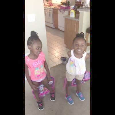 A woman talks to her twin young girls to make sure that they have everything they need for school and one of the girls doesn't have pants on. Their mom asks if they have their pants and they both say "yes." Then the other girl points to her sister and says that she doesn't have pants and the girl gets embarrassed.