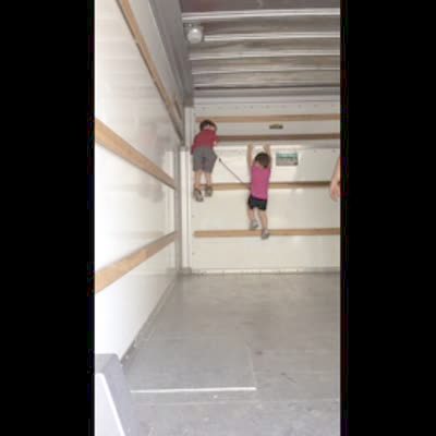 A young boy and girl hook the same bungee cord to their shorts while they climb in a box truck and the girl climbs down and the bungee cord pulls the boy's shorts down.