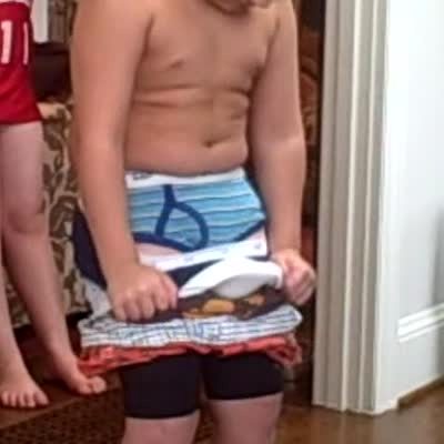 Young chubby boy walks into living room wearing multiple pairs of underwear. He takes each one off.