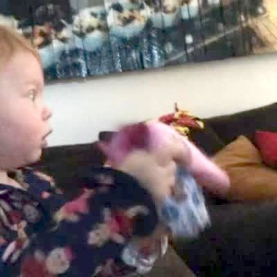 A tot girl opens up her Christmas present and gets underwear, and shouts out she got underwear, and giggles.
