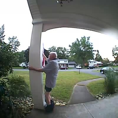 A senior man walks out front to adjust his flag and his pants drop, but he does not acknowledge them. Security footage.