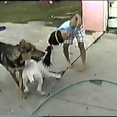 Boy tries to fill kiddie pool with hose but dog won't let go of it. They play tug of war. Dog pulls boy into the water.