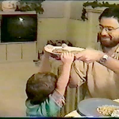 Dad and tot boy tug of war over plate of cookies at dinner table, plate finally flies across room when tot lets go; tot picks up a cookie and runs off with it