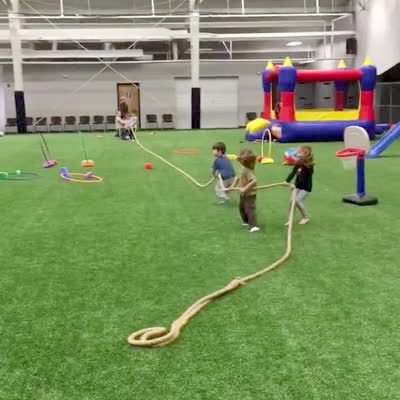 A group of young kids have a tug-of-war at an indoor park and one of the boys runs to the other side. Another boy runs to the other side as well, so it's just one girl left on that side. She starts to lose, so she runs to the other side as well.