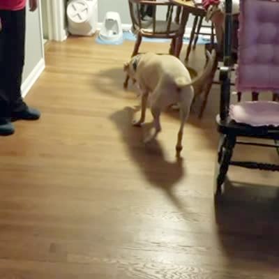 The camera man throws a tennis ball in a living room and two small dogs run to retrieve it. One dog grabs the ball with its teeth and runs to the camera man to return it to him. The other dog grabs at its tail and pulls it back across the floor so that it can't return the ball.
