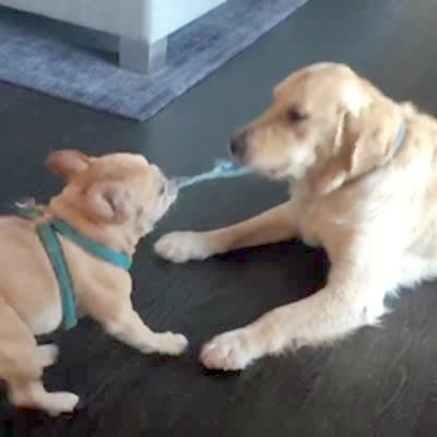 Two dogs have a tug-of-war with a rope in the living room indoors. A small dog pulls hard and runs in place to get the rope from the larger dog that just lays there.
