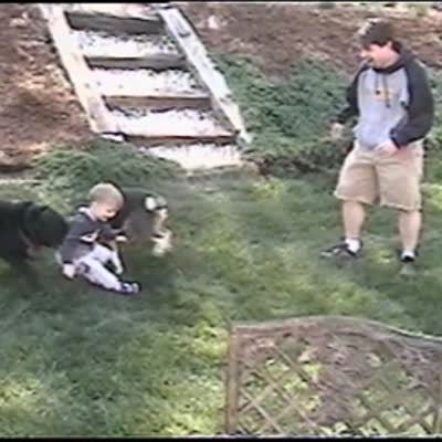 Dogs play tug of war with stuffed animal. Laughting tot boy gets in the middle and gets dragged around the backyard. With recovery.