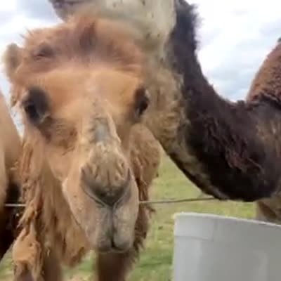 A man feeds a camel outside his window on a Safari. The camel takes the whole food bucket out of the man's hands and pours the bucket on top of itself.