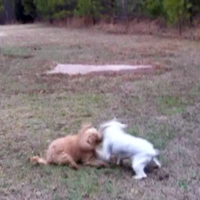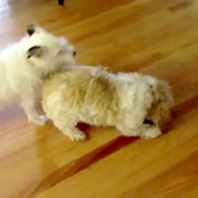 A Chihuahua dog reaches between a Doodle puppy dogs legs while they fight over a toy and waddle around the living room.