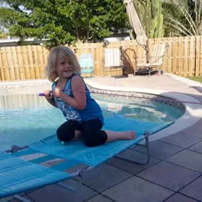 Two girls pull on either end of a jump rope when one of them lets go and she and her lounge chair fall into a pool outdoors.