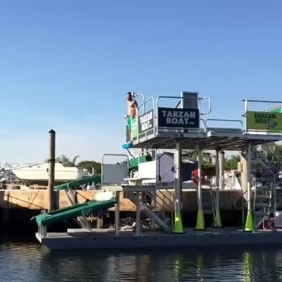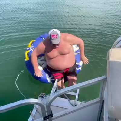 A man jumps off a boat onto a tube and flips over into the lake.