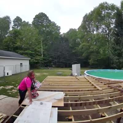 A woman attempts to climb up on a deck that is under construction. A board slips and she loses her balance and falls to the ground. Security footage.