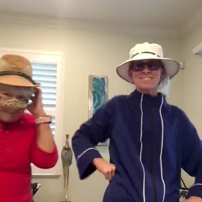A senior woman and another woman record a video to wish a couple well for their wedding, but then one holds the other's leg up and the fall.