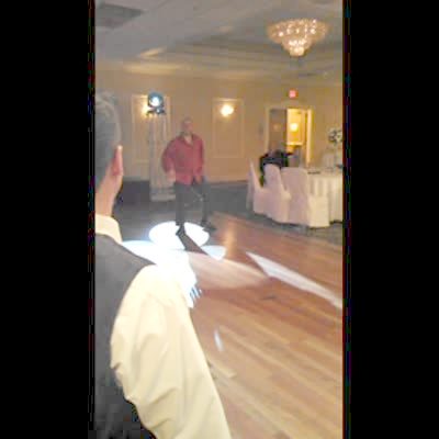 A groom tries to do a sexy dance for his bride, as she sits on the dance floor at their wedding reception, when he attempts a hand-stand but kicks her in the head instead. She then falls out of the chair. Featured talent cleared (bride and dancing groom). Music rights not cleared.