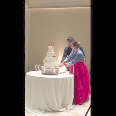 At a wedding reception, a bride smashes cake on a groom's face when he smashes some in her face and she stumbles and falls backwards. Music rights not cleared.