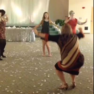 A woman dances at a wedding reception crouches down, gets low and falls over while trying to stand back up. Music rights not cleared.