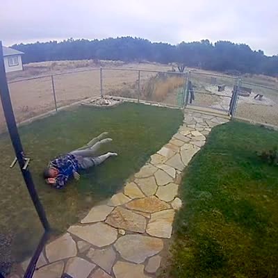 A man and a woman take the garbage cans up the driveway but the wind is so strong that the lid hits the wife in the head and she falls down. Security Footage.
