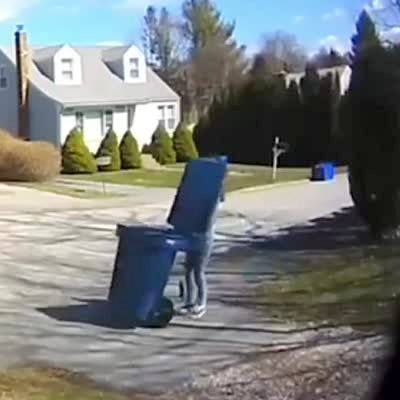 A woman tries to drag a trash can into her garage, but the wind flips the lid up in her face. Security footage.