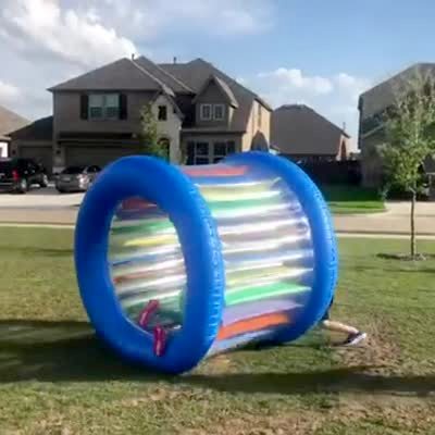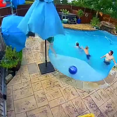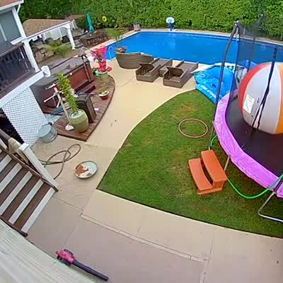 An above ground pool flips on top of a man in a yard. Security footage.