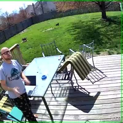 A man changes a garbage bag in the backyard, and a gust of wind blows the lid into his head. Security footage.