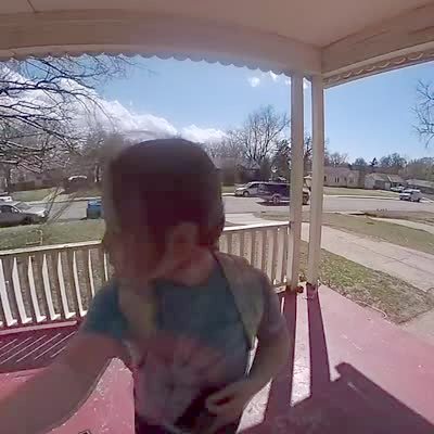 A young girl twirls on a front porch when a door swings open and hits her as she flips backwards off of the porch. Security footage. Featured talent cleared only (the woman, the young girl and the baby).