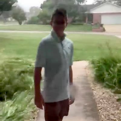 A young girl shrieks as she takes a video of a young boy on a front porch and a trampoline flies by the house due to heavy wind.