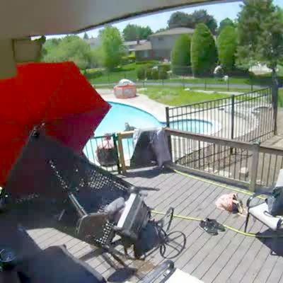 The wind blows a patio table umbrella in the air. A senior man tries to catch it and falls down the steps of the back deck. Security footage.
