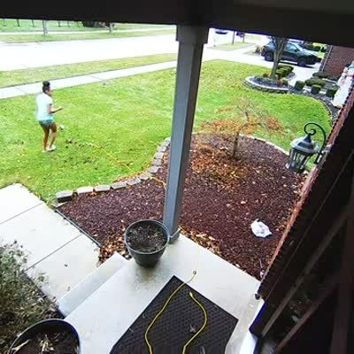 A woman moves the trash can in the windy yard, and the lid hits her in the face repeatedly. Security footage.