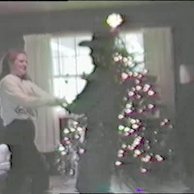 CHRISTMAS GREETING DOG Dog. Woman gives X-mas wishes to camera, dog knocks over tree.