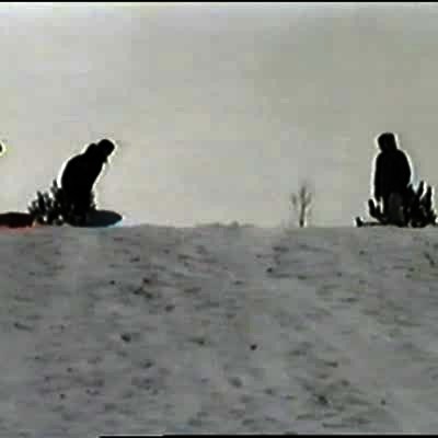 (RS) - boy slides down mountain on snow sled, wipes out, hits in water