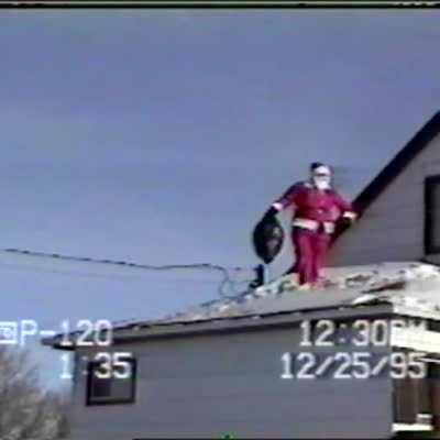 X-mas; Santa jumps from roof onto trampoline, then falls off